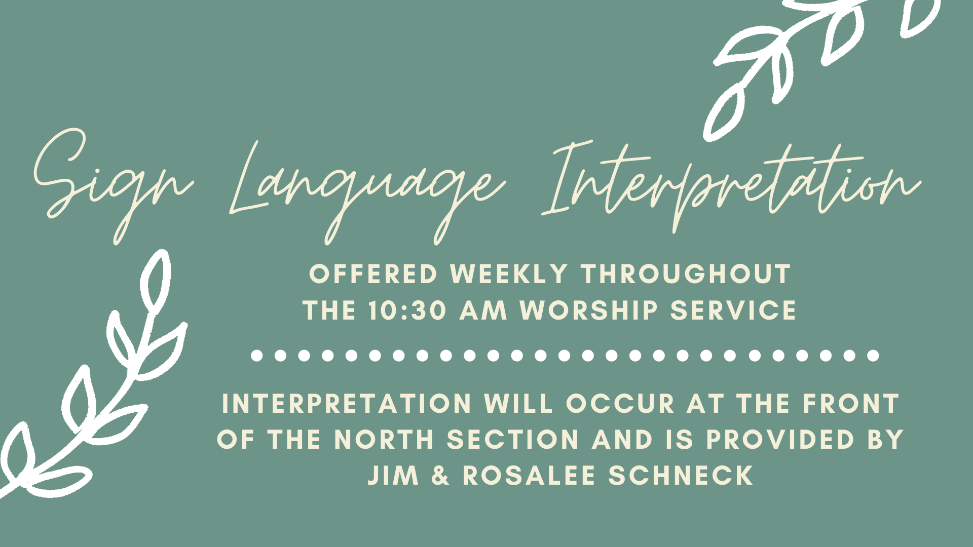 We're excited that you’re here! We pray you will discover a warm group of real people dedicated to following our Lord and Savior, Jesus Christ. Join us on Sundays for worship, fellowship and Biblical message. We have Sunday School for age two through adults as well as nursery care for infants and toddlers during the worship services. Each week, the 10:30 am service will provide sign language interpretation for the Deaf, both in-person and via Livestream.
